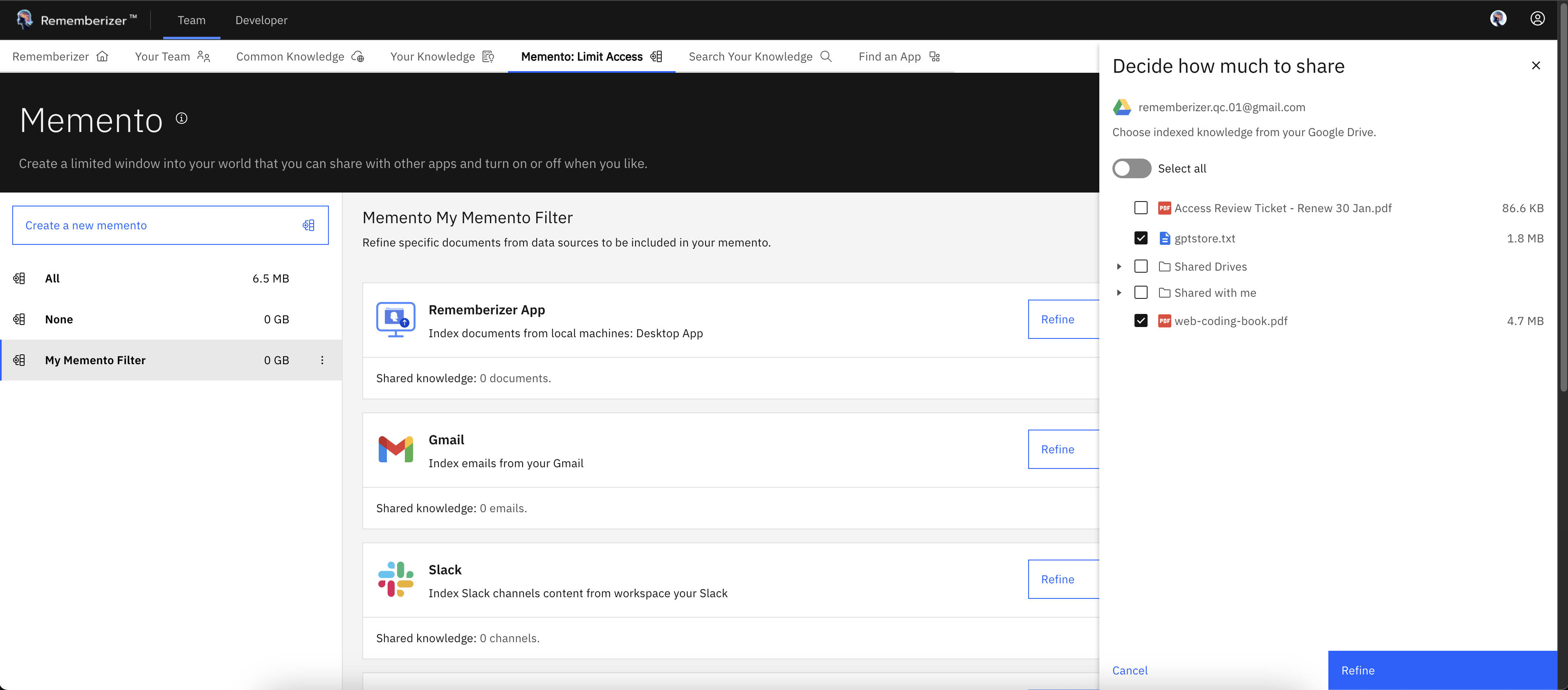 الخطوة 2: أضف معرفتك إلى منصة Rememberizer عن طريق الاتصال بـ Gmail أو Dropbox أو Google Drive، إلخ...