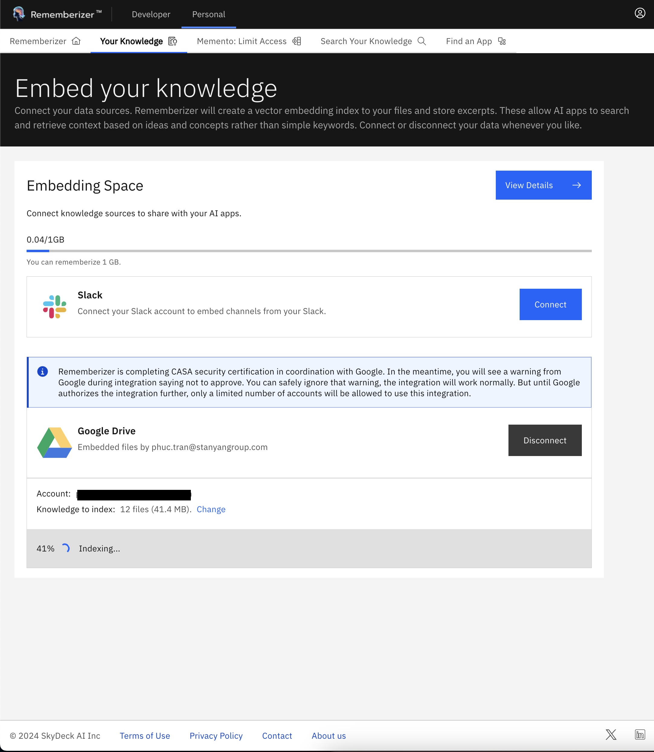 After selecting the files, click "Add" to start embedding your knowledge. You also need to check the box to agree with Rememberizer's policy of sharing your Google Drive data with third-party applications that you have specifically approved.